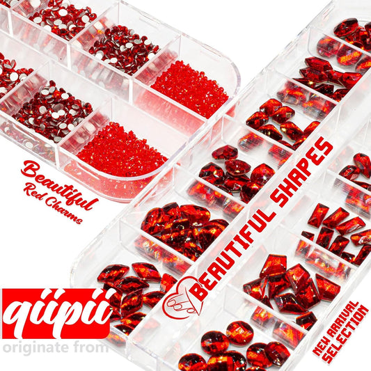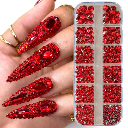 12Grids Red Nail Gems Rhinestones 2/3/4/5Mm Flat-Back Nail Crystal Diamond SS6/10/16/20/30 Mixed Luxury Glass Rhinestones Charms
